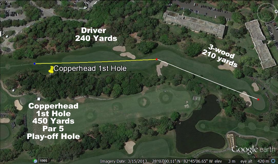 He had a mud-ball, so lected to play a 3-wood from 210 yards which had to be hit high and with a hint of a fade so as to sit softly whilst still clearing the protective front and side bunkers. He pulled the shot off and was left with 15 feet for Eagle which he then converted.