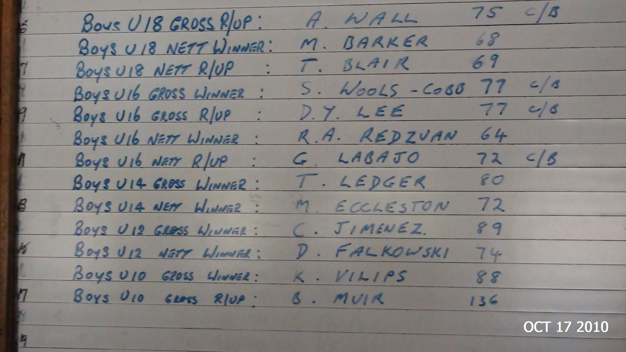 October 17: Winner, 2010 Ian Baker-Finch/AustraliaZoo Classic, Queensland, Australia. Under 10 Years Gross Winner. Karl's 88 was also the best Gross score in the Under 12's.