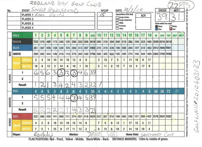 September 28: Winner. Karl shoots 39 Gross in Australia's PGA run Pump Golf Shootout held on the FrontNine of the Redland Bay Golf Club's 2909 Meter (3181 Yards) Par 36 layout. Hisscorecard included four successive "3's" on it.With his win hequalified to get into a draw for the national grand prize.