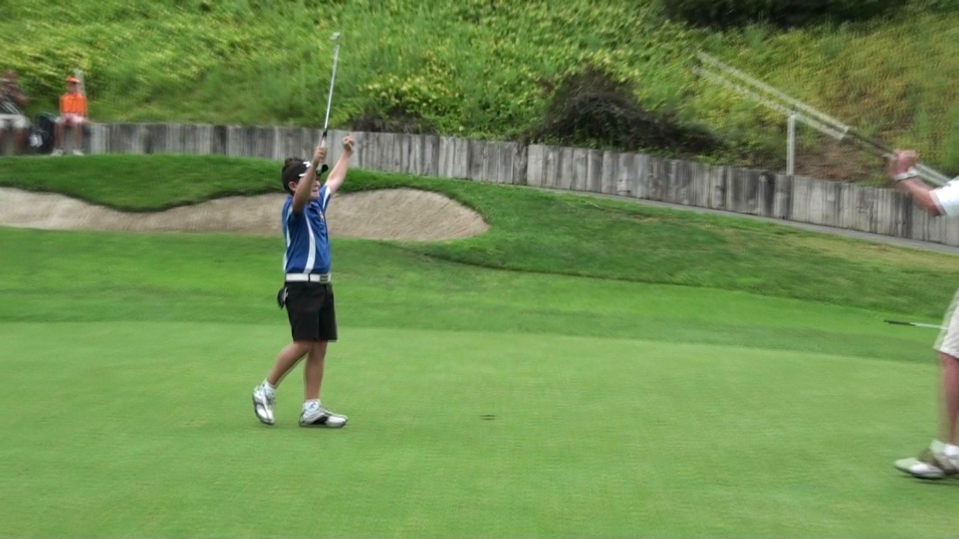 The other boys in his group started the day a shot ahead of Karl and by the completion of the 9th hole he had taken the lead in his threesome. However, somewhere around the 12th hole Karl had gotten word from the gallery that last year's champion Michael Thorbjornsen in the group ahead was shooting the lights out. At that stage Karl was a couple over Par yet leading his group by quite a few (they would eventually return cards of 77 & 76) so Karl put the pedal to the metal and Birdied holes 12, 15, 16 & 17 to try to catch up, but ultimately came up 2-shots short when he Bogied the last hole where he needed one more Birdie to force a Play-off.